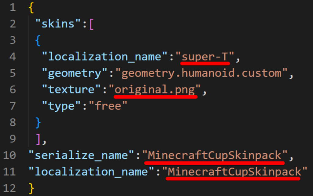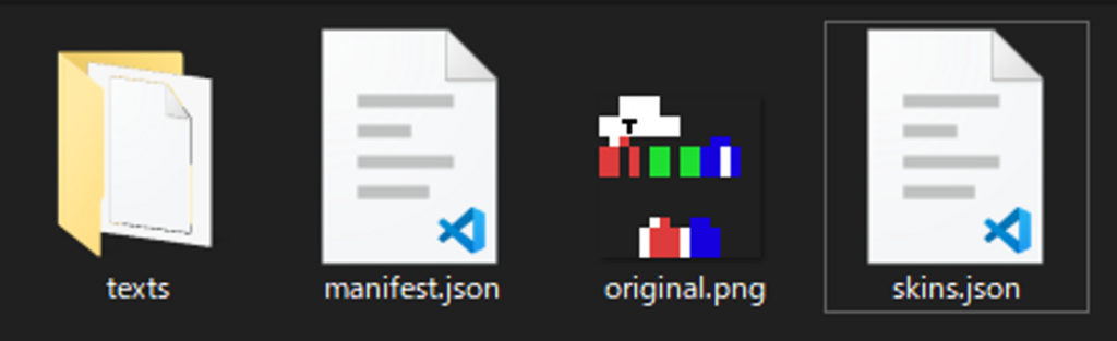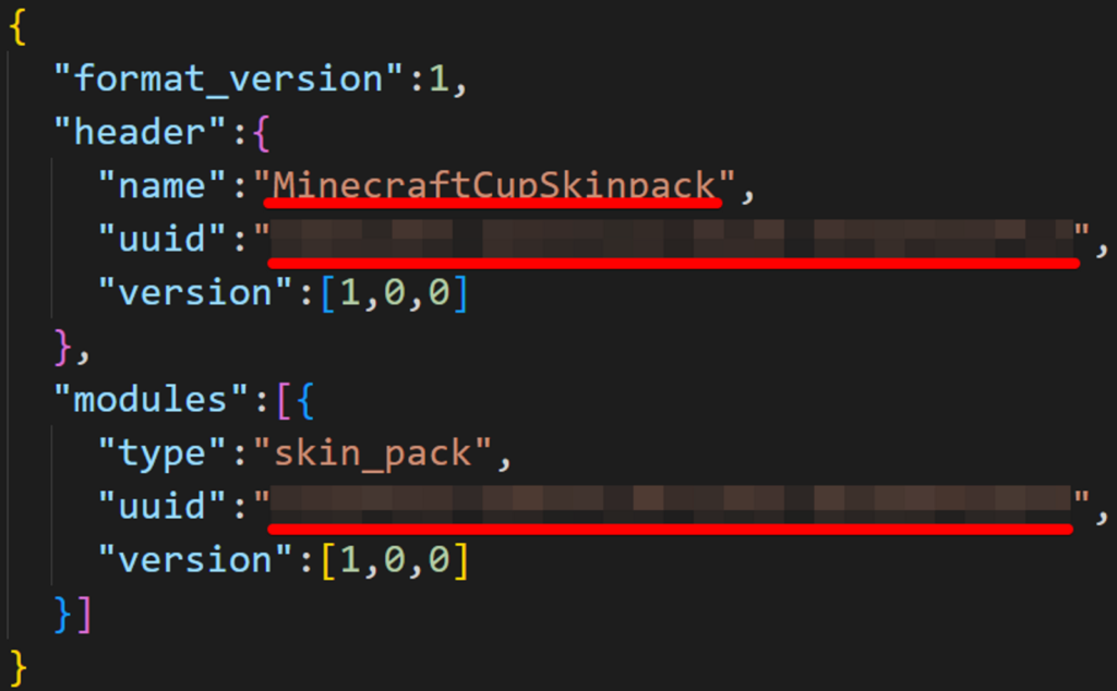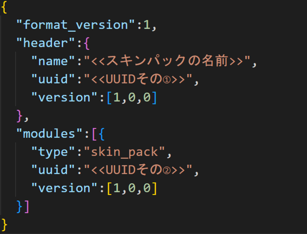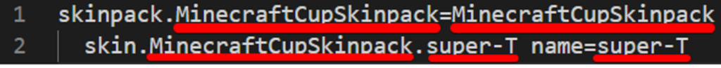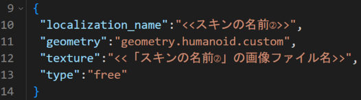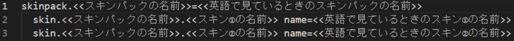 以上のように、スキンパックの名前とスキンの名前を入れます。今回はスキンは1つだけなので、3行目は削除しました。