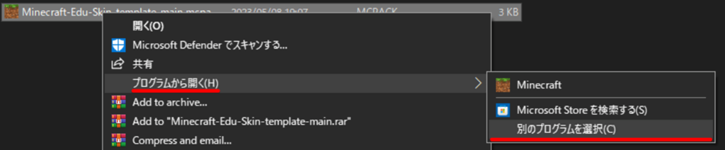 Mcpackのファイルの上で右クリック→プログラムから開く→別のプログラムを選択