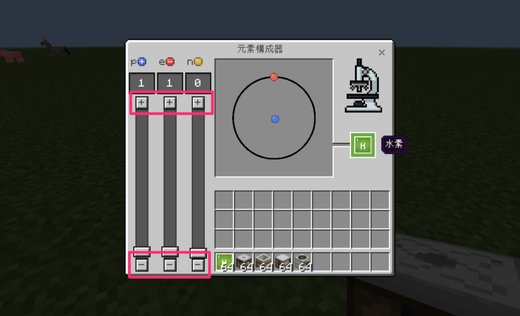 「p+」「e-」「n」の数を変えて、元素を作ることができます。そもそも水素を作るためには、元素構成機を使う必要があるというわけです(今回はクリエティブなのであまり使いません)
