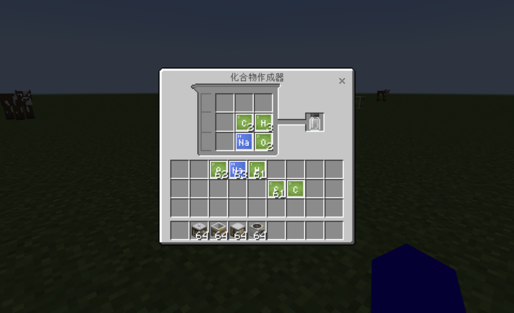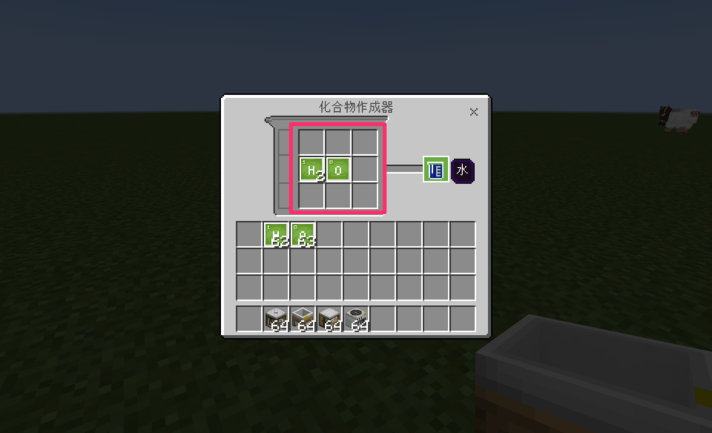 化合物作成機は化合物を生成するためのものです。例えば、水は「H2O」という化学式があり、その通りの数の元素を化合物作成機に配置すると、水ができました。