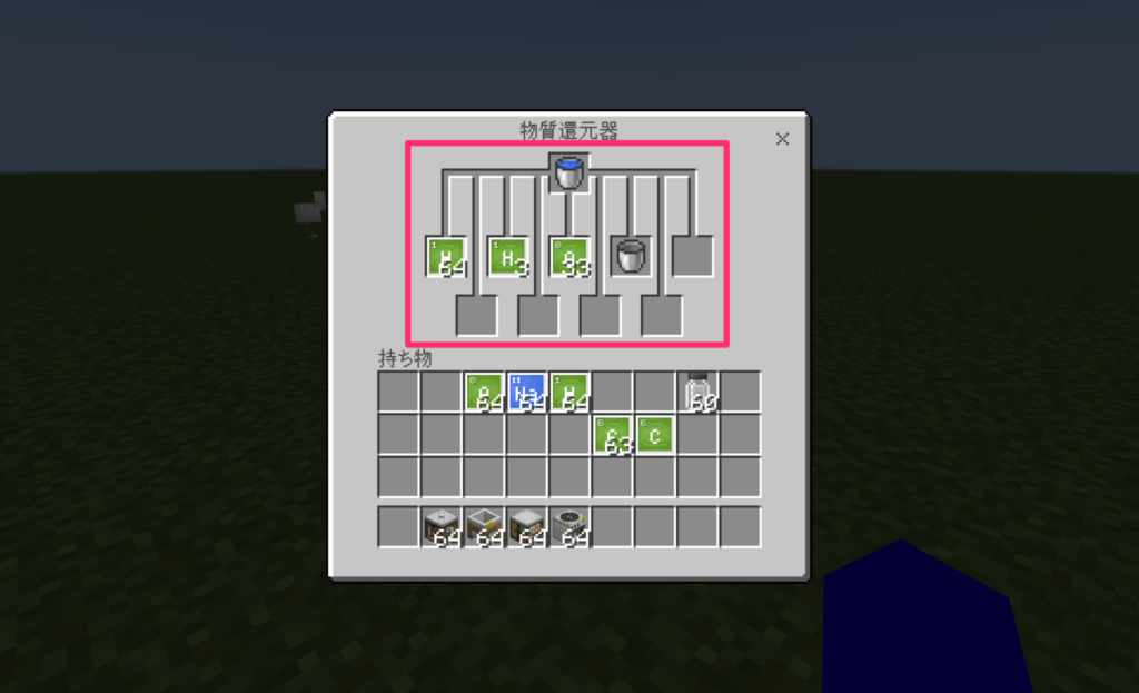 この物質還元機は、一番上のスロットにアイテムを入れると、そのアイテムの物質を還元してくれるものになっています。試しに、上の画像のように水バケツを入れてみると、バケツと水(H2O)に還元されました!