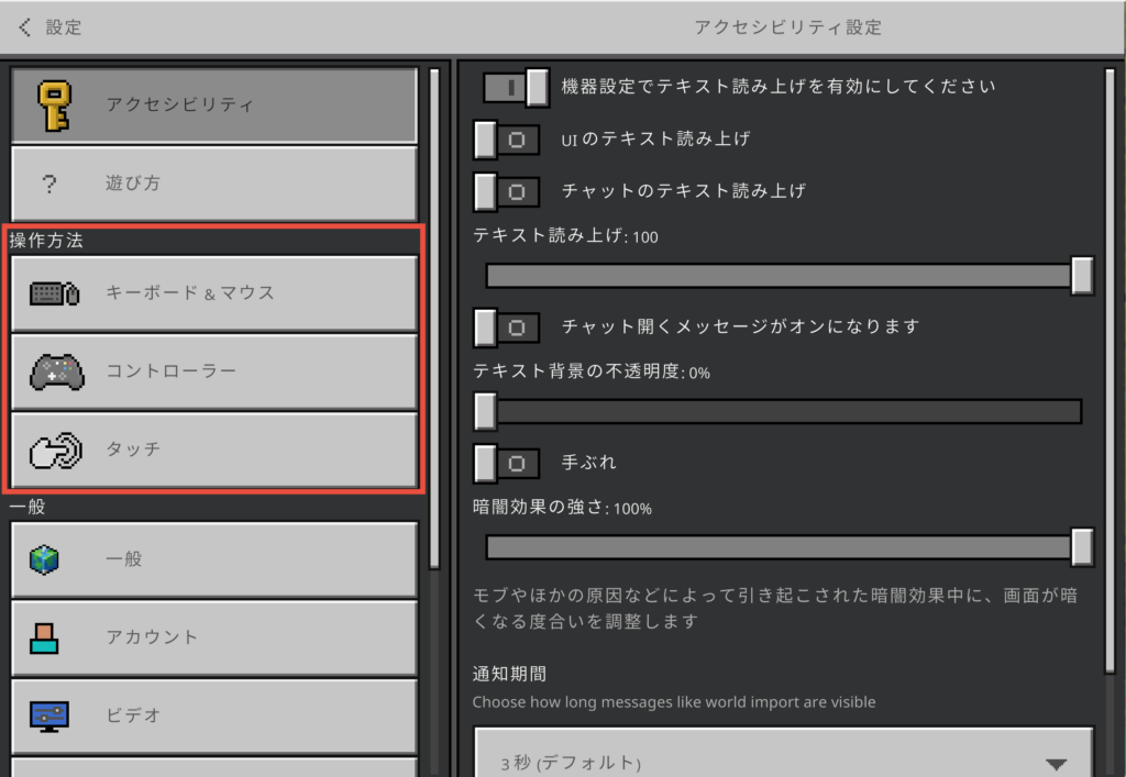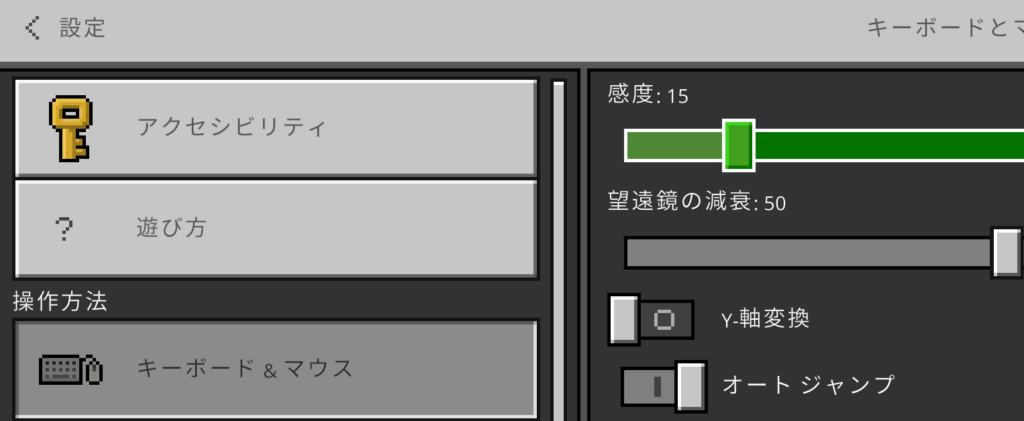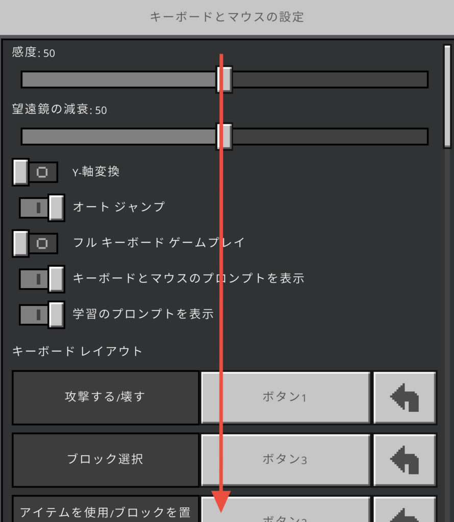次にマインクラフトのプレイヤーの操作方法に関する設定です。