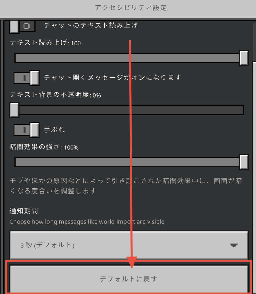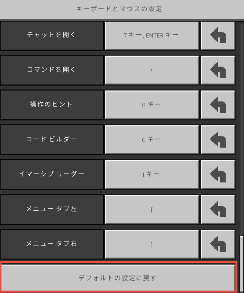 デフォルトに戻す、というのは教育版マインクラフトをインストールした時の最初の設定に戻す、という意味です。これは、設定画面に共通した操作で各設定を戻すことができます。