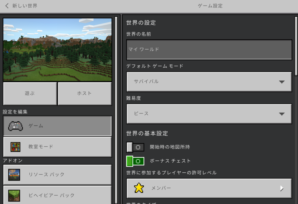 これから建築するのですから変更するためには「オン」にしないと、と思ってしまいますが実はオンにしてしまうとワールドが変更出来なくなってしまいますので注意してください。実際にブロックが置けないという質問があった時、この設定がオンになってしまっていた事例があります。