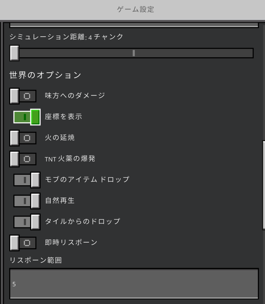 コマンドやMakeCodeプログラミングをする場合は座標が重要な情報となるので「座標を表示」をオンにしておきましょう。