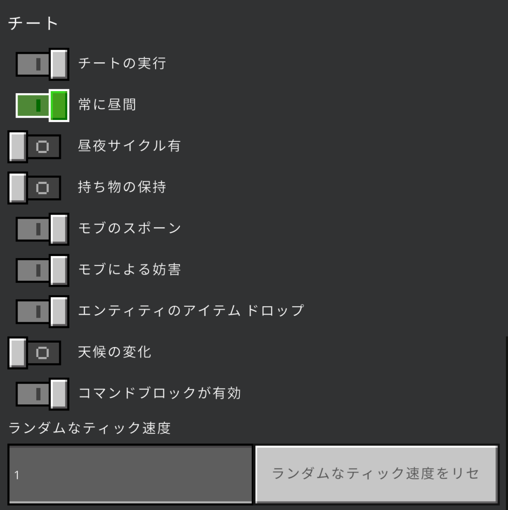 なのです。つまり、オンにすると変更が出来ない(不変の)世界になるのです。ブロックが置けない時は確認してみましょう。