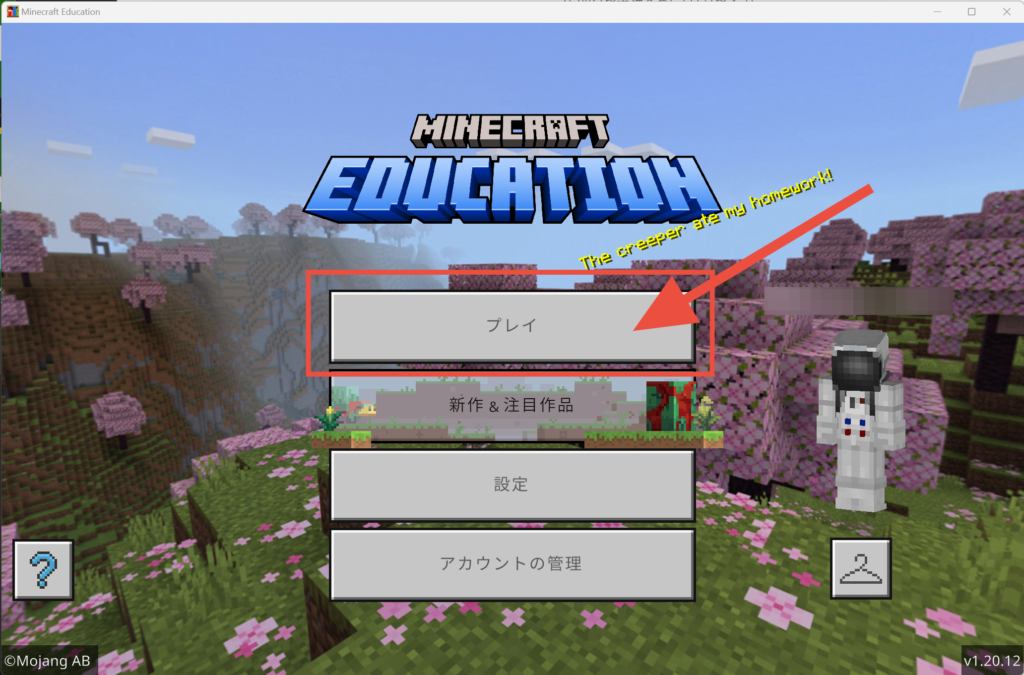 教育版マインクラフトを起動してサインインしている状態で【プレイ】をクリックします。