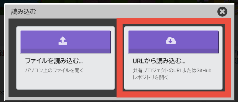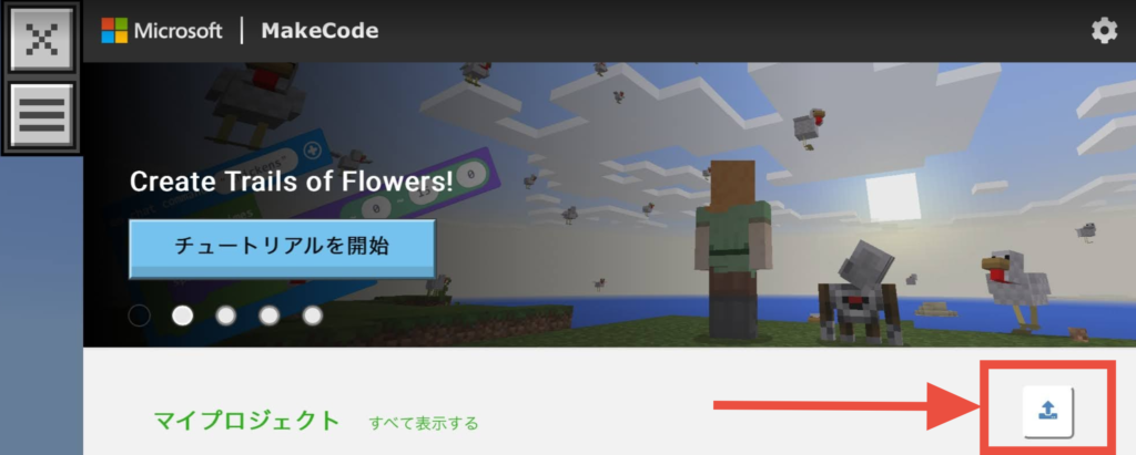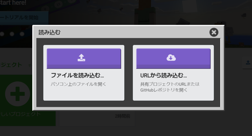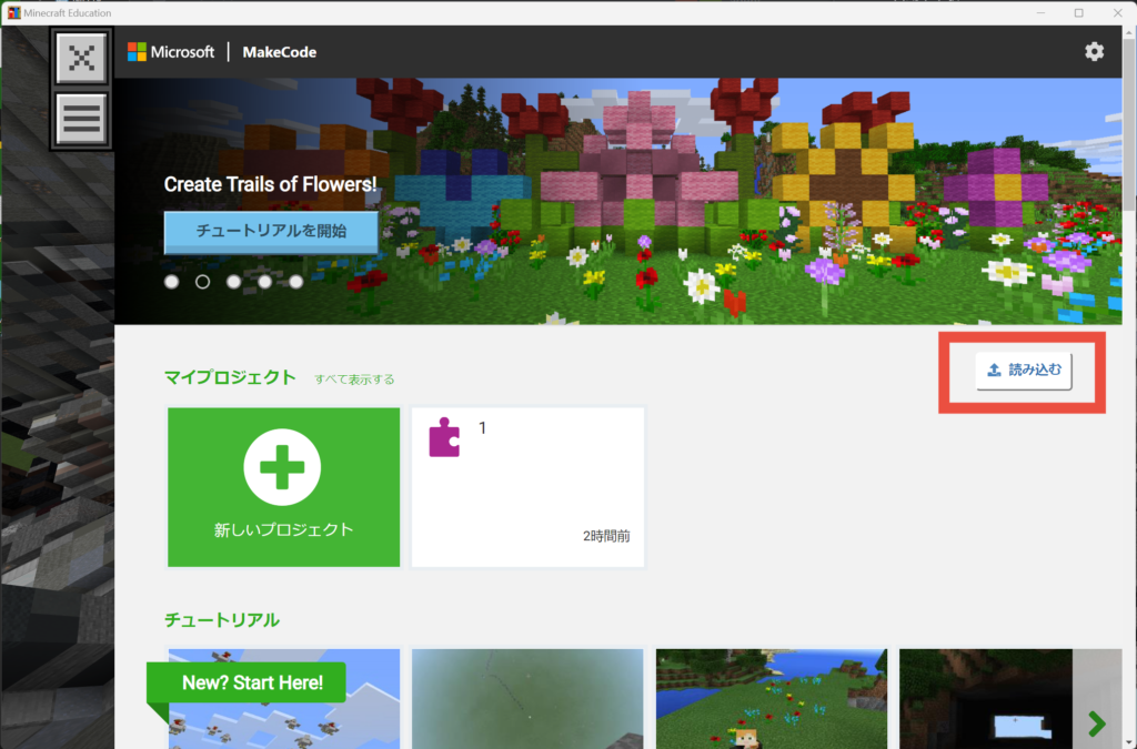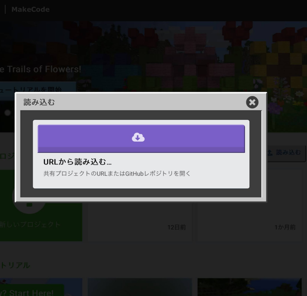 2.Web版MakeCode for Minecraftを開いて【読み込む】をクリックします