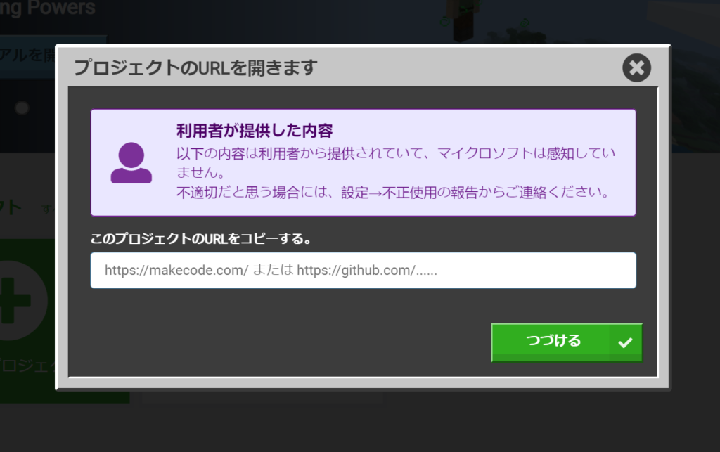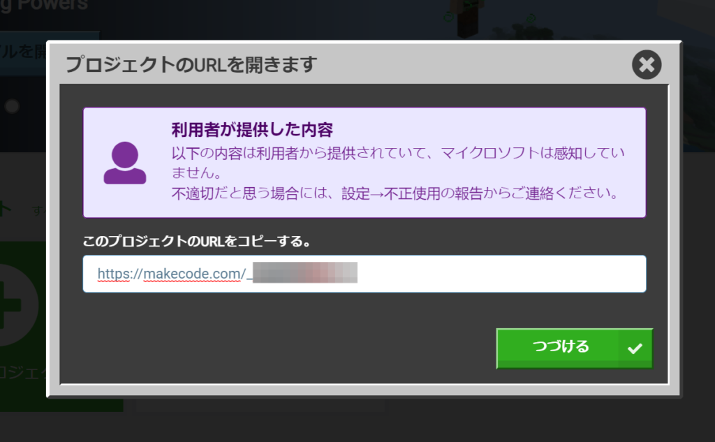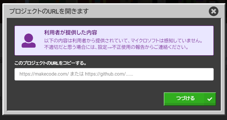 クリップボードにコピーしておいたURLを貼り付けて【つづける】をタップすればMakeCodeプログラムが読み込まれます。