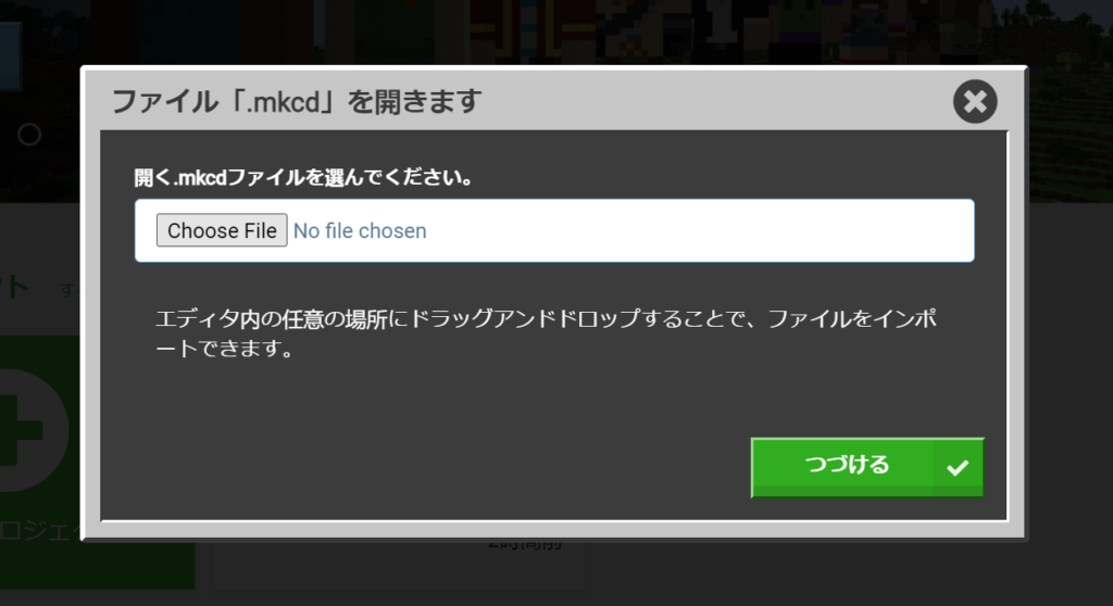 ファイルとして保存しておいたMakeCodeプログラムを【Choose File】ボタンを押して表示されるファイルダイアログでファイルを指定して開くをクリックしてください。