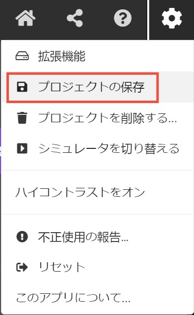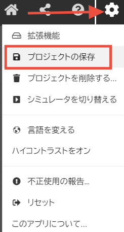 5.Web版MakeCode for Minecraftの右上にある歯車マークをクリックして【プロジェクトの保存】をクリックします。
