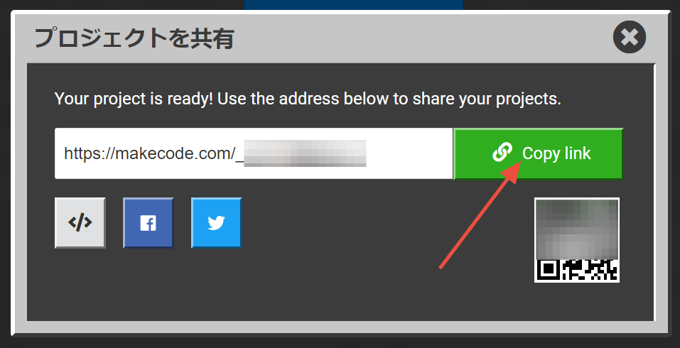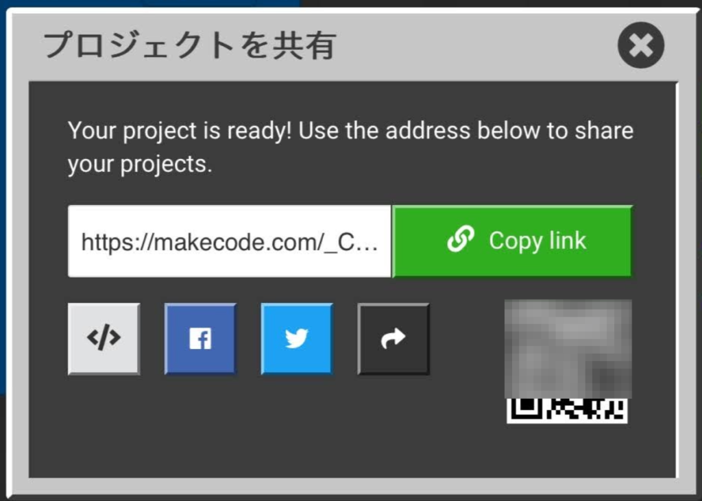 1.保存したいMakeCodeプログラムを開き、コードビルダー右上の共有アイコンをクリックしてください。