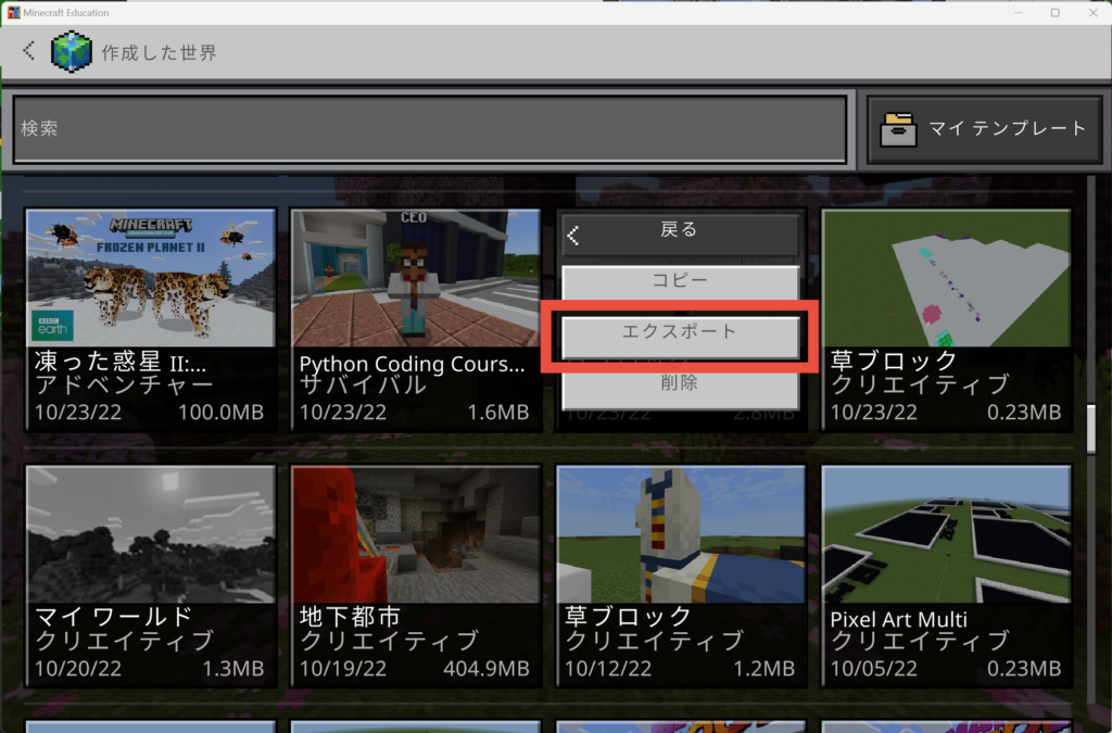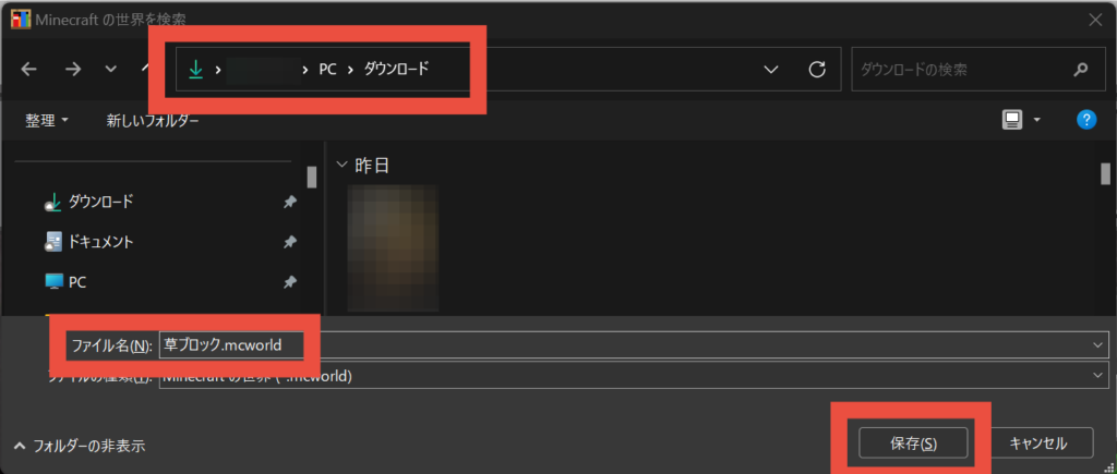 ※この方法はWindowsPC環境の教育版マインクラフトのみとなります。後述する方法で、その他のプラットフォームでもファイル保存は可能ですので最後までお読みください。