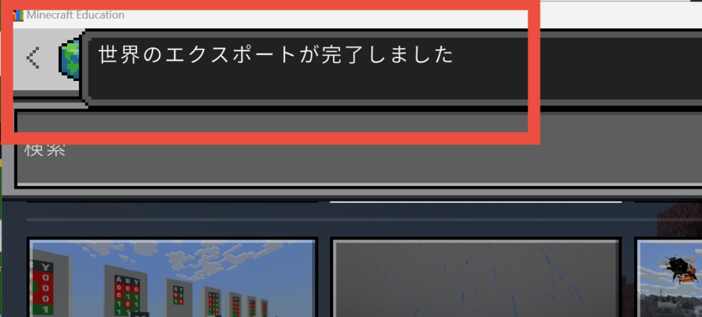 【世界のエクスポートが完了しました】と表示されれば、ファイルに保存が完了したことになります。