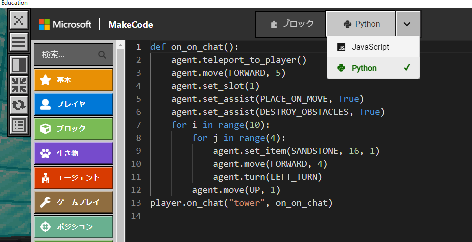 教育版マインクラフトではMakeCode(メイクコード)というビジュアルプログラミングを使って、一瞬で建築物をつくったり、エージェントと呼ばれるロボットに単純作業を代わりにやらせることができます。