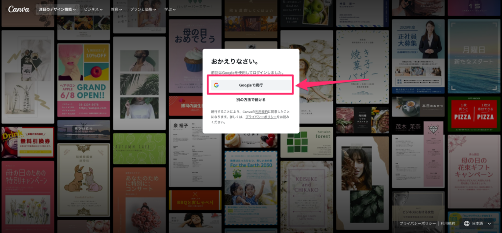 まずはCanvaにアクセスします。「Googleで続行」を押してGoogleアカウントでログインしましょう。