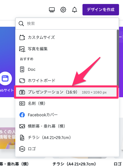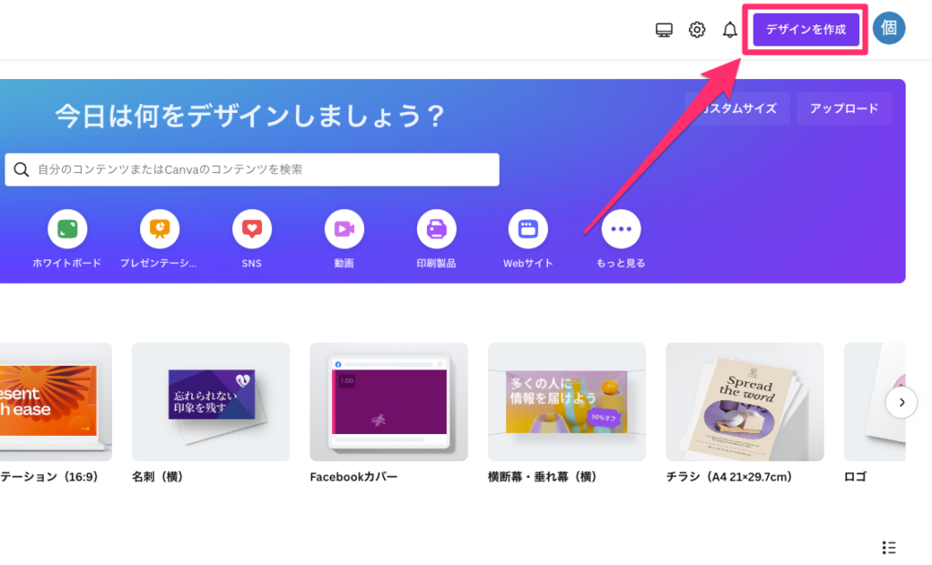 右上の「デザインを作成」をクリックします。