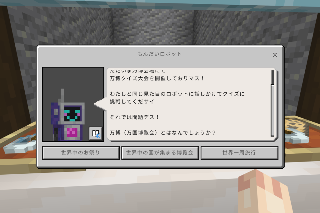ワールドに入ると、最初にもんだいロボットから万博についての質問がされます。