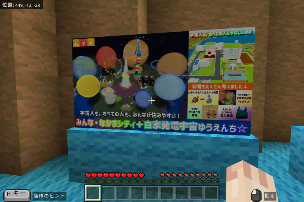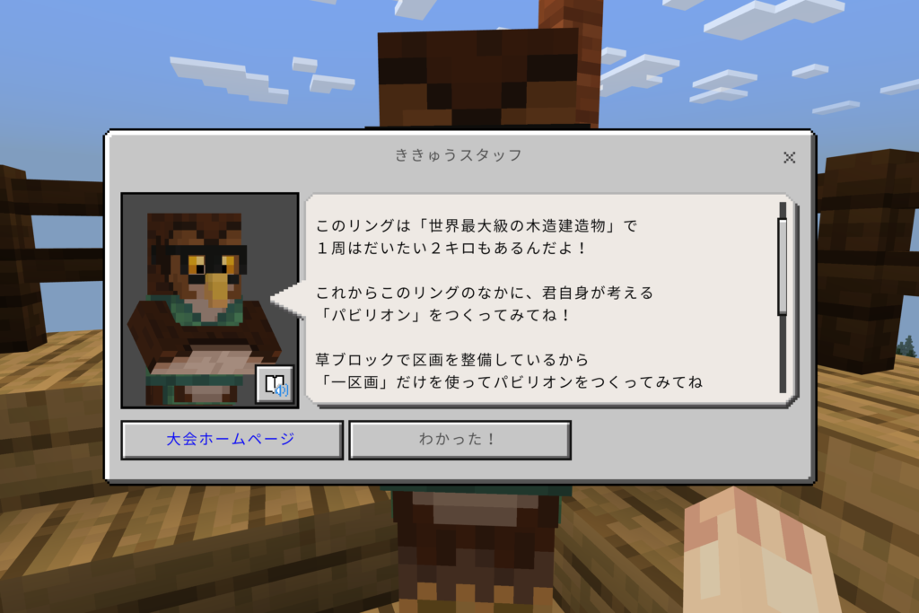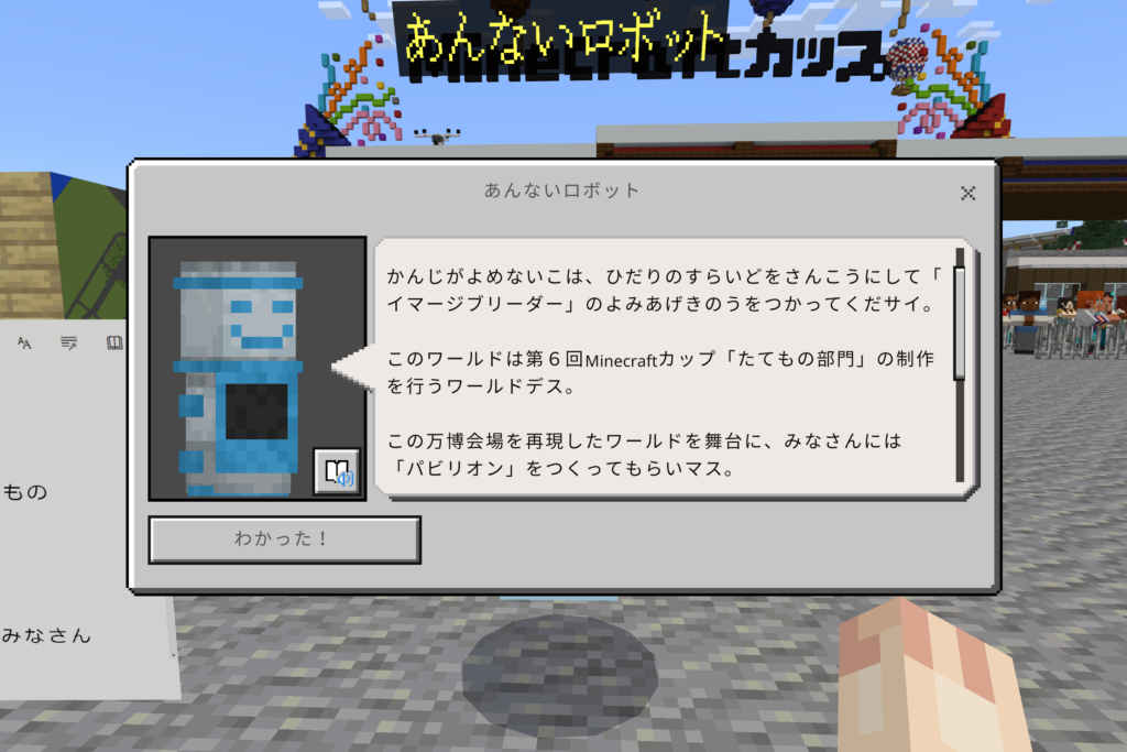記念館の中に入ると、作品展示だけでなく、今年(第6回Minecraftカップ)のテーマやたてもの部門について教えてくれるので、かいせつロボットの話を聞きながらお楽しみください。