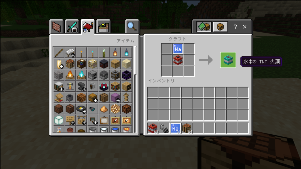 以下の画像のように、TNT爆弾の上にNa(ナトリウム)ブロックを置くだけで水中のTNTをつくることができます。