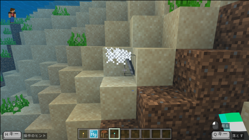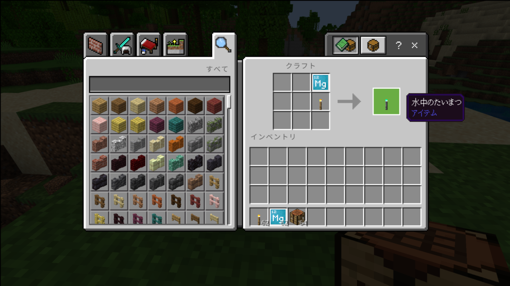 TNT爆弾と同様、たいまつを水中に置くことはできませんが、Mg(マグネシウム)ブロックを使うことで水中にたいまつを置くことができるようになります。