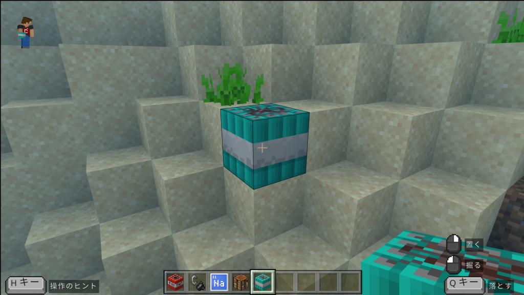 以下の画像のように、たいまつの上にMg(マグネシウム)ブロックを置くだけで水中のたいまつをつくることができます。
