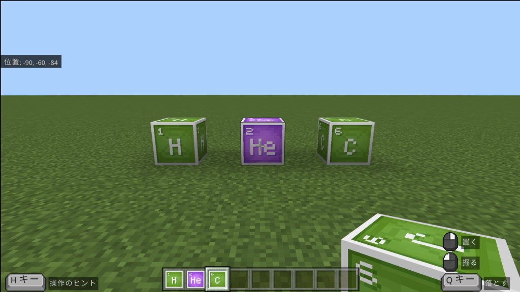 今回使用する元素ブロックは1番のH(水素)ブロックと2番のHe(ヘリウム)ブロック、6番のC(炭素)ブロックです。
