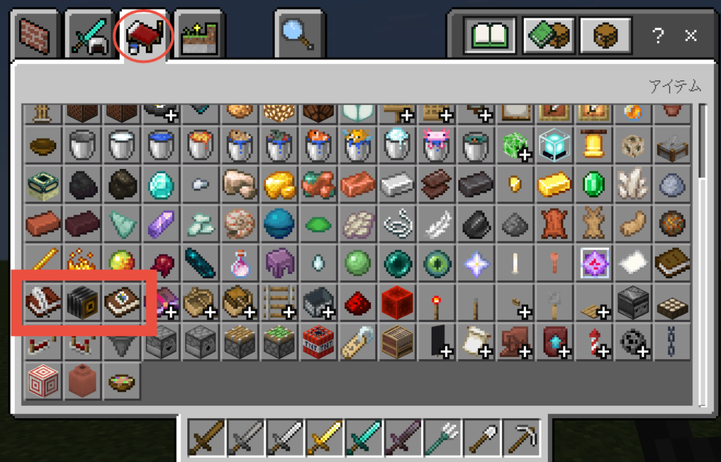 教育版マインクラフトには印刷できる形式でレポートをまとめるアイテムが用意されています。インベントリの以下の場所にあるアイテムを確認してみましょう。